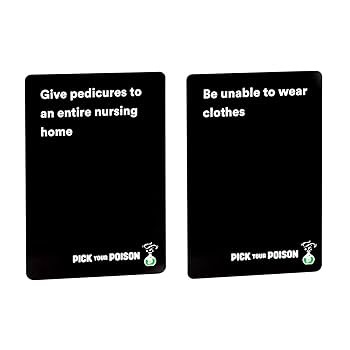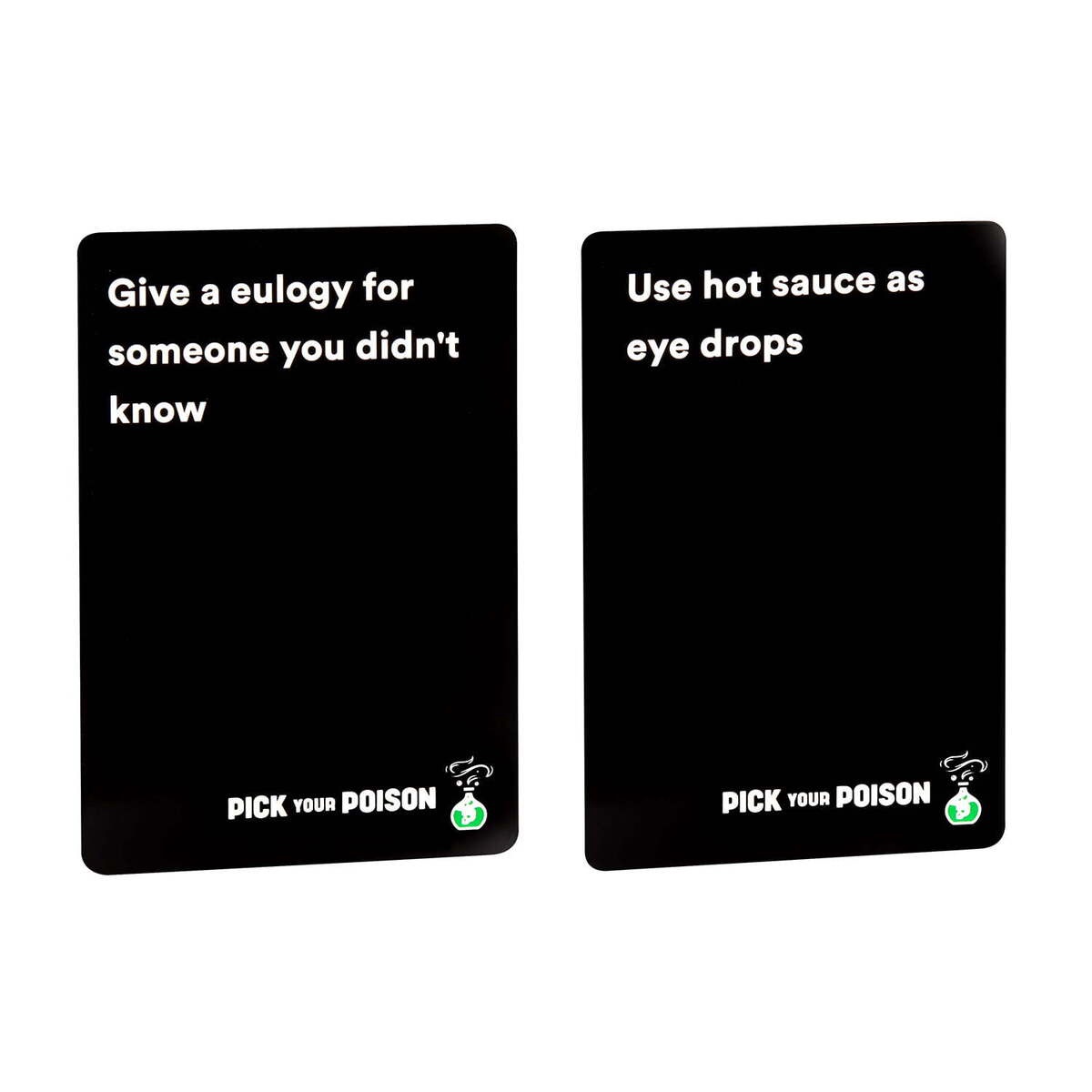 Gameplay: Each Round one player is the Judge. The Judge combines two Poison cards creating a really hard “what would you rather do?” scenario. Players ask questions about the Poison cards and the Judge expands on them as they wish. Players anonymously “Pick their poison” and hope the other players agree with them. Votes are revealed and points are tallied by the Judge. The Judge wins when players disagree, players win when they vote with the majority of other players. WHICH WOULD YOU CHOOSE? Example "Would You Rather..." Cards: "Fall out of a moving rollercoaster car" OR "Eat a 6-oz portion of scabs" OR "Use hot sauce as eye drops" - and hundreds more! Contents: Game Board, 300 Poison Cards , Pick and Double Down cards for 16 players, Score Sheet, 5 house rules.