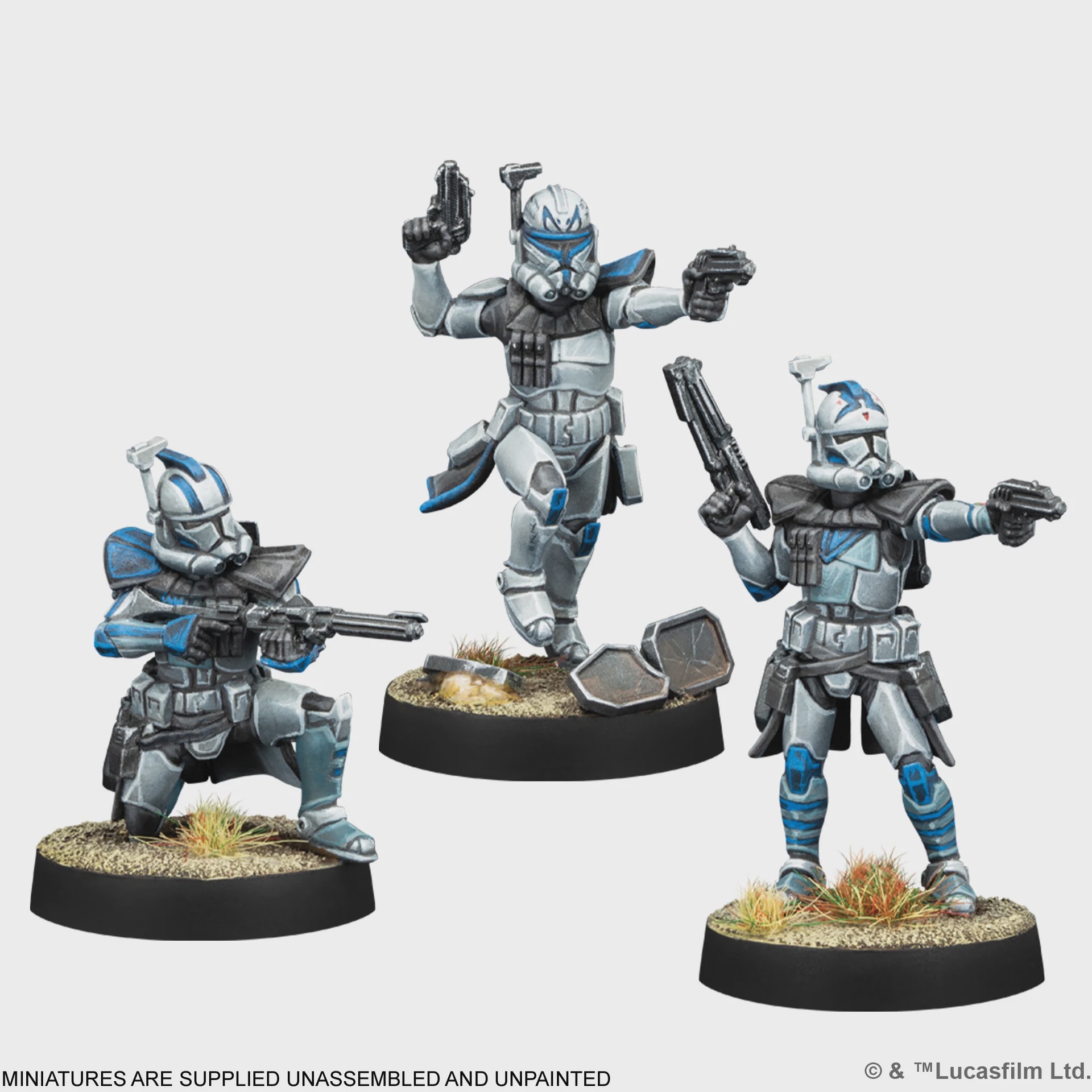 This expansion adds three Commander options and two Clone Trooper upgrade character options to the Galactic Republic Army. The pack includes new hard plastic sculpts of Obi-Wan Kenobi, Captain Rex, and Anakin Skywalker, each of which can be used as a Commander option in Galactic Republic armies. Additionally, this box contains new hard plastic sculpts of the clone ARC troopers Fives and Echo, who can be added to various clone trooper units as upgrades. All characters in this box are resculpts of their previously released versions and share the same updated rules as them. Only the miniatures themselves are new. This box also updates the cards to the current live version.
